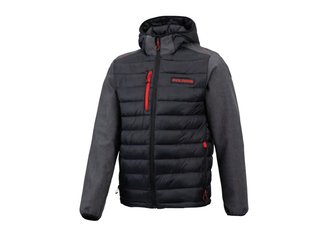Pánská černo-šedá přechodná bunda Polaris na zip s kapucí, a červenými detaily.