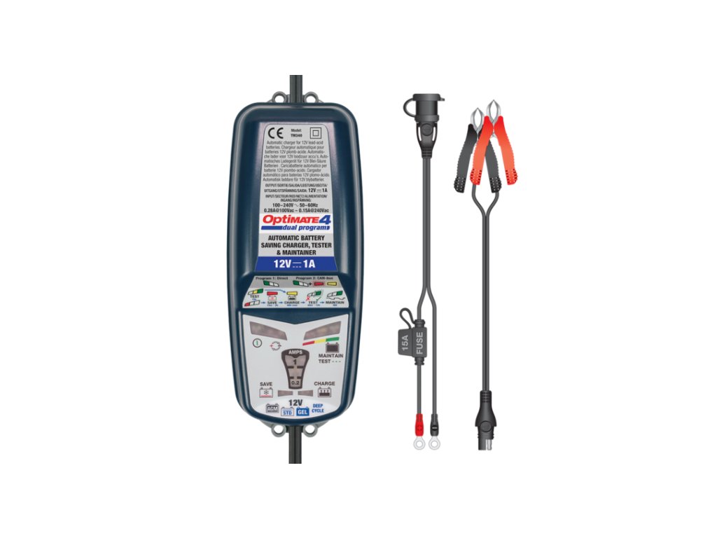 - Vlastnosti: OptiMate 4 Dual Program testuje před a po nabití a dokáže obnovit „vybitou“ baterii již od 0,5 V.