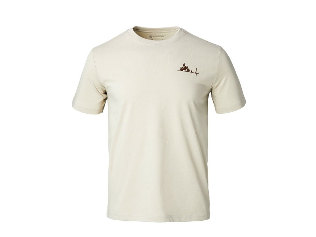 Volnočasové béžové tričko CFMOTO s piktogramem motorkáře vpředu a grafikou Experience More Together na zádech. Materiál: 70 % bavlna, 30% polyfibraBuďte první, kdo napíše příspěvek k této položce.