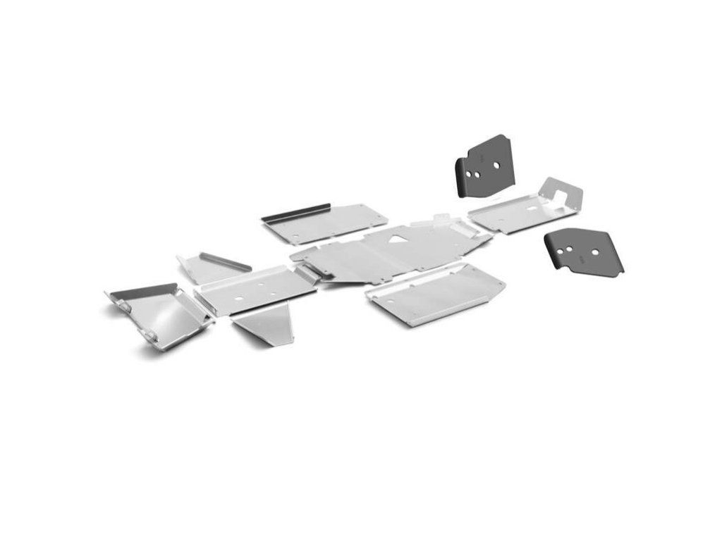 Hliníkový ochranný kryt podvozku z nabídky originálního příslušenství CFMOTO pro dlouhou verzi čtyřkolky CFMOTO Gladiator X625 modelového roku 2023 a novější. Sada obsahuje kryty střední části podvozku a ramen včetně instalačního materiálu. - Vyrobeno z vysoce pevného hliníku tloušťky 5 mm, kryty ramen mají tloušťku 8 mm - Modifikovaná verze pro Gladiator X625-A modelového roku 2023 s přepracovanou konstrukcí zadních ramenDoplňkové parametry